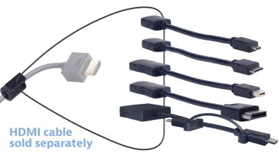 * 1 Adapter Cable DisplayPort male to HDMI female 5 inches long (AR-DPM-HDF) * 1 Adapter Cable Mini-DisplayPort male to HDMI female 5 inches long (AR-MDPM-HDF) * 1 Adapter Cable Micro-HDMI "D" male to HDMI female 5 inches long (AR-MDHM-HDF) * 1 Adapter Cable Mini-HDMI "C" male to HDMI female 5 inches long (AR-MCHM-HDF) * 1 MHL Compatible micro USB to HDMI adapter cable (AR-MHLM-HDF) * 1 Base security clamp, cable and hardware for DL-AR system (DL-CL)