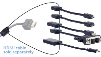 * 1 Adapter Cable Mini-DisplayPort male to HDMI female 5 inches long (AR-MDPM-HDF) * 1 Adapter Cable Micro-HDMI "D" male to HDMI female 5 inches long (AR-MDHM-HDF) * 1 Adapter Cable Mini-HDMI "C" male to HDMI female 5 inches long (AR-MCHM-HDF) * 1 Adapter Cable DVI male to HDMI female 5 inches long (AR-DVM-HDF) * 1 Adapter Cable USB "C" male to HDMI female 5 inches long (AR-UCM-HDF) * 1 Base security clamp, cable and hardware for DL-AR system (DL-CL)