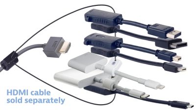 * 1 Adapter Cable DisplayPort male to HDMI female 5 inches long (AR-DPM-HDF) * 1 Adapter Cable Mini-DisplayPort male to HDMI female 5 inches long (AR-MDPM-HDF) * 1 4K DisplayPort to HDMI Cable Adapter 5 inches long (AR-DP4K-HDF) * 1 4K Mini DisplayPort to HDMI Cable Adapter 5 inches long (AR-MDP4K-HDF) * 1 Apple Certified Adapter Lightning (M) to HDMI (F) and Lightning (F) to power device (MD826AM/A) * 1 Apple Certified Adapter USB C to HDMI w/USB A Port (MJ1K2AM/A) * 1 Adapter Cable USB "C" male to HDMI female 5 inches long (AR-UCM-HDF) * 2 Security clamp to attach Apple Adapters to DL-AR system (DL-AP) * 1 Base security clamp, cable and hardware for DL-AR system (DL-CL)