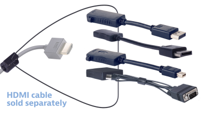 * 1 Adapter Cable DisplayPort male to HDMI female 5 inches long (AR-DPM-HDF) * 1 4K DisplayPort to HDMI Cable Adapter 5 inches long (AR-DP4K-HDF) * 1 4K Mini DisplayPort to HDMI Cable Adapter 5 inches long (AR-MDP4K-HDF) * 1 VGA + USB to HDMI Adapter Cable 8 inches long (AR-VMU-HDF) * 1 Base security clamp, cable and hardware for DL-AR system (DL-CL)