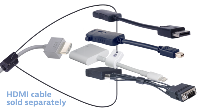 * 1 Adapter Cable DisplayPort male to HDMI female 5 inches long (AR-DPM-HDF) * 1 4K Mini DisplayPort to HDMI Cable Adapter 5 inches long (AR-MDP4K-HDF) * 1 Apple Certified Adapter Lightning (M) to HDMI (F) and Lightning (F) to power device (MD826AM/A) * 1 VGA + USB to HDMI Adapter Cable 8 inches long (AR-VMU-HDF) * 1 Security clamp to attach Apple Adapters to DL-AR system (DL-AP) * 1 Base security clamp, cable and hardware for DL-AR system (DL-CL)